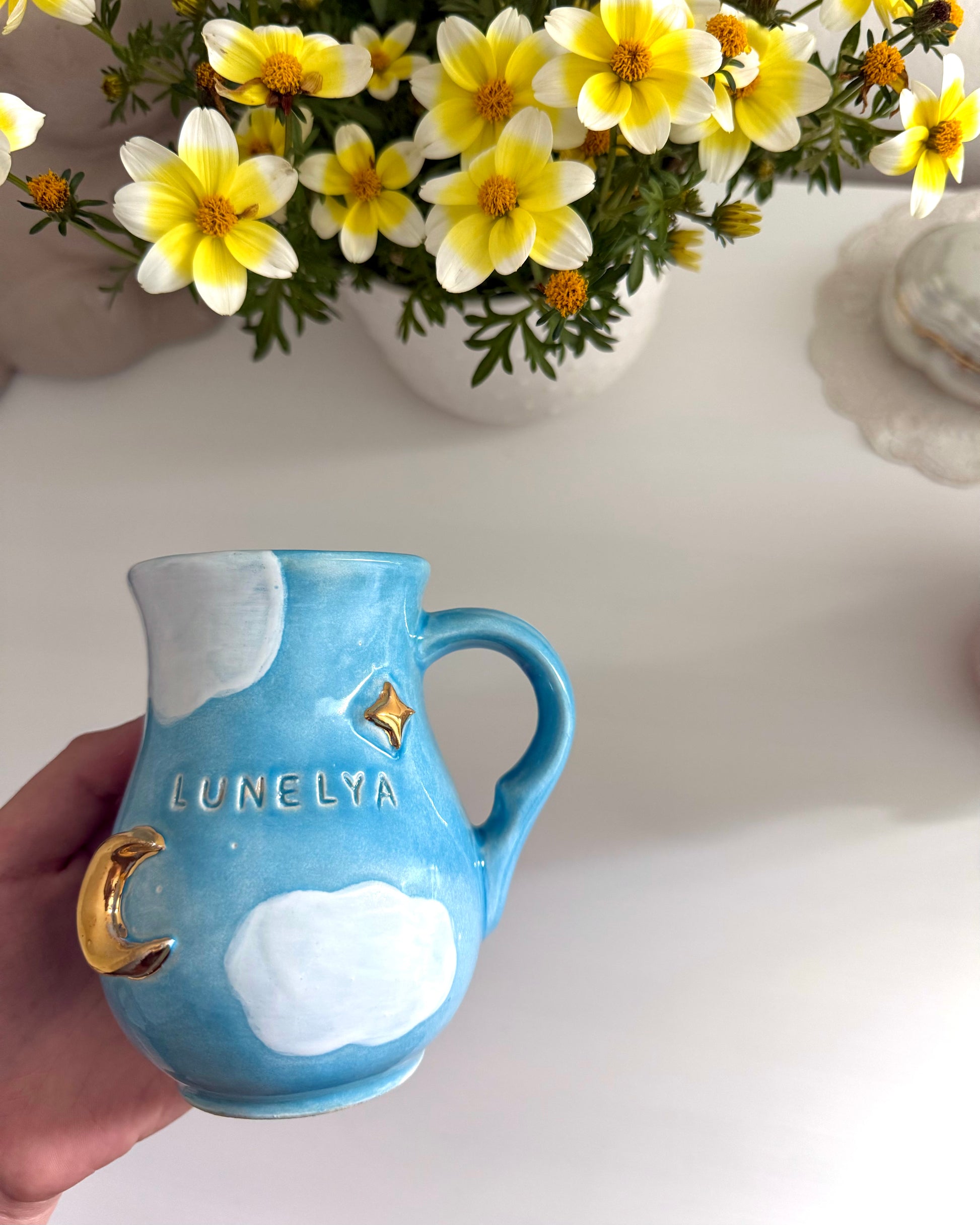 ♡ Pichet nuage bleu et or Lunélya : la lune et l'étoile sont réalisées avec un lustre d'or, nécessitant une troisième cuisson.
